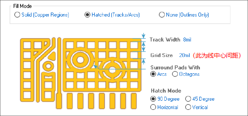 【注意Altium Designer鋪網格的間隙是線中心距離,需要減去線寬才得間隙大小】