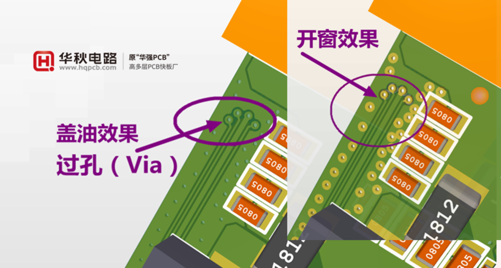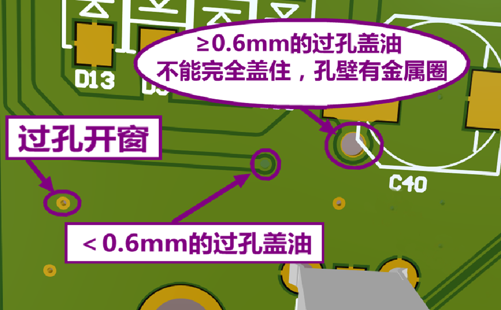 過孔蓋油,阻焊油能將<0.6mm的過孔焊盤完全蓋住,>0.6mm的過孔焊盤做蓋油可能無法完全遮蓋。