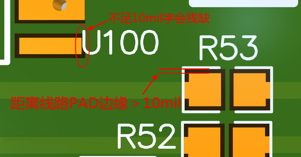 絲印文字和器件框距離焊盤的邊緣>10mil ,為了避免絲印蓋住焊盤影響焊接,<10mil的部分會被掏除掉。< span="">