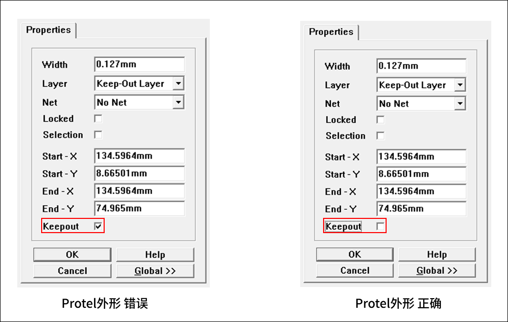 所有需要制作的外框及內槽都不能勾選Keepout 。