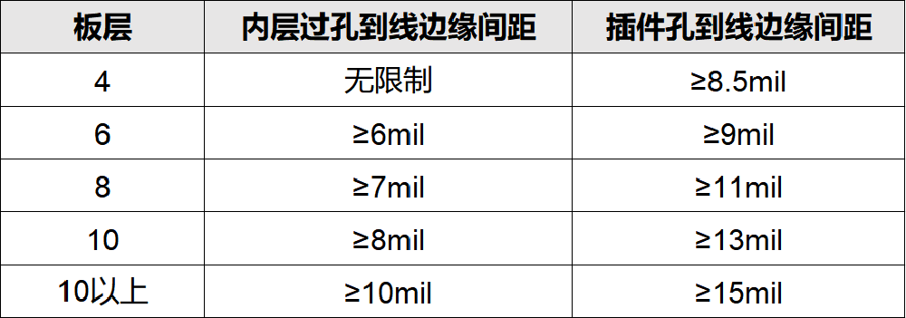 4)內層過孔、插件孔到線邊緣間距: