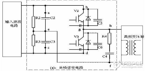 2.高頻逆變電路的電磁兼容設計,如圖所示,C2、C3、V2、V3組成的半橋逆變電路,V2、V3為IGBT、MOSFET等開關元件,在V2、V3開通和關斷時,由于開關時間很快以及引線電感、變壓器漏感的存在,回路會產生較高的di/dt、dv/dt突變,從而形成電磁干擾,為此在變壓器原邊兩端增加R4、C4構成的吸收回路,或在V2、V3兩端分別并聯電容器C5、C6,并縮短引線,減小ab、cd、gh、ef的引線電感。在設計中,C4、C5、C6一般采用低感電容,電容器容量的大小取決于引線電感量、回路中電流值以及允許的過沖電壓值的大小,LI2/2=C△V2/2公式求得C的大小,其中L為回路電感,I為回路電流,△V為過沖電壓值。