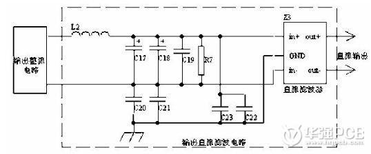 輸出直流濾波電路主要用于切斷電磁傳導干擾沿導線向輸出負載端傳播,減小電磁干擾在導線周圍的電磁輻射。