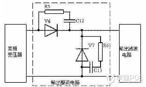如圖所示為輸出半波整流電路,V6為整流二極管,V7為續流二極管,由于V6、V7工作于高頻開關狀態,因此輸出整流電路的電磁干擾源主要是V6和V7,R5、C12和R6、C13分別連接成V6、V7的吸收電路,用于吸收其開關動作時產生的電壓尖峰,并以熱的形式在R5、R6上消耗。