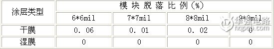 表中的數據表明了濕膜的附著力比干膜好得多,相對于精細線條的制作濕膜要好得多。