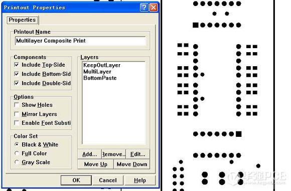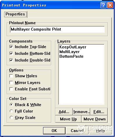 這里面有幾個選項是值得注意的:colorset必須選擇Black&White(黑白打印)做頂層打印文件時Mirror Layers(鏡像)要勾上,其實就是把圖紙左右翻了180度。接著,我們開始底層打印:在打印屬性對話框的Layer里加入這三個層: KeepoutLayer(禁止布線層),multiLayer(機械層),bottomlayer(底層)設置好以后就如下圖