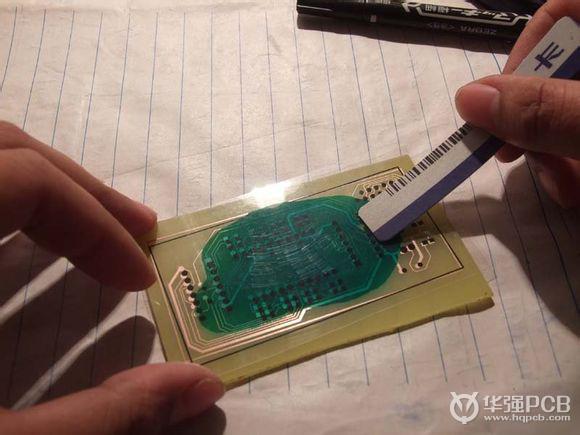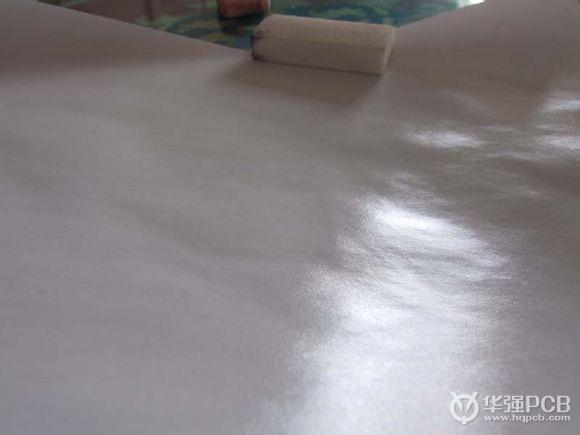 上綠油,現在圖上面的量剛剛好,大約是巴掌大的板用1.5毫升的樣子,涂在一處即可,涂得太開了貼膜的時候容易產生氣泡。這時候,之前打印的膠片終于可以派上用場了,把有油墨的一面對著電路板貼上去,用刮片慢慢把綠油刮開。
