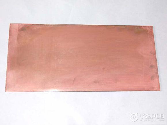 轉印相信很多老玩家已經是輕車熟路了,不過照顧到還不熟悉的玩家,在這里有一些地方還需要強調一下。因為我們要做的PCB是有阻焊膜的,為了方便揭膜在敷銅板下料時每邊要留出3到5毫米的余量,用細砂紙打磨干凈。下面這一步將直接影響到轉印的質量:取少量的三氯化鐵或者是以前用過的廢液,把打磨好的板子放進去,用毛刷在銅箔上輕輕刷幾遍。立馬取出用水沖干凈,晾干,銅箔會變成這個顏色。