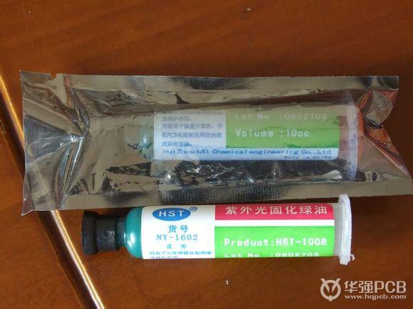 這東西是我找了很久才找到的一種比較合適的材料,可以在淘寶上搜“紫外光綠油”或者“紫外光固化綠油”,PS:我不是到這里做廣告的,只是有人問在哪里能買到。還有一樣東西就是找個廢的電話卡剪成1厘米左右寬的刮片,刮膠的時候要用。