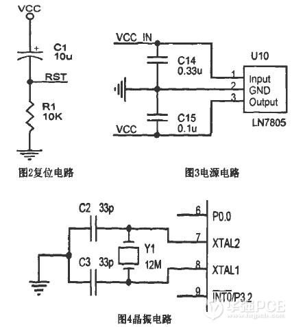 圖2、圖3和圖4分別為復位電路、電源電路和晶振電路。復位電路中的RST網絡標號連接至STC12C5410AD單片機的引腳3,該電路上電復位。由于STC12C5410AD單片機工作電壓在5.5~3.5V之間,因此電源用的是5V的開關電源,為了AD轉換準確,加入了一個LM7805穩壓芯片。