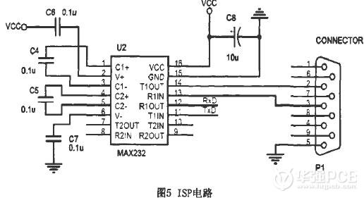 ISP(In—System Programming)在系統可編程,指的是電路板上的空白器件可以編程寫入最終用戶代碼,而不方需式要擦從除電或路再板編卜程取。下傳器件統,的已80經51編單程片的機器調件試也可程以序用的I刪SP要使用編程器或者仿真器,比較繁瑣,而STC12C5410AD支持在ISP,只要加入圖5中的電路,就可以通過串口利用STC單片機PC端ISP下載摔制軟件將要調試的程序寫到電路板上的單片機中。下圖中的網絡標號RxD和TxD分別連接到STC12C5410AD單片機中的P3.0口和P3.1口。