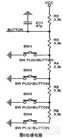 由于Io口資源有限,而STCl2C5410AD自帶AD轉換,因此采用AD轉換做按鍵掃描,按鍵電路如圖6。其中BUTTON網絡標號連至單片機的P1.0AD轉換口。
