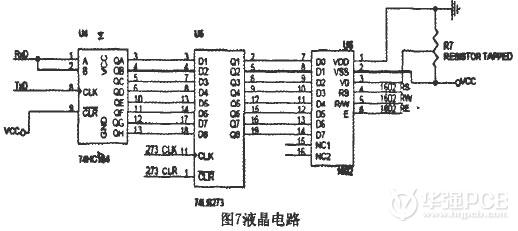 液晶顯示電路示于圖7,因為STC12C5410AD單片機的Io口有限,而1602液晶屏需要8個數據口,因此使用了一個74HC164芯片將串口的輸入轉為并口的輸出,并且加入了一個74LS273鎖存器芯片防止在串行移入的過程中將不需要的數據送入1602液晶屏,導致顯示錯誤。