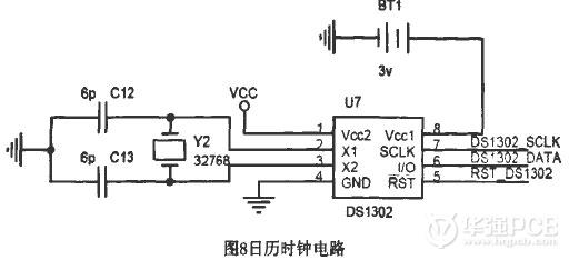 日歷時鐘電路示于圖8,采用的是Dallas公司推出的DS1302芯片,是IIC接口的芯片。STC12C5410AD單片機沒有IIC通信口,是用兩個IO口通過軟件來模擬IIC接口。DS1302_SCLK和DS1302_DATA兩個網絡標號連接到STC12C5410AD單片機的P2.2和P2.3口,在這兩個u上各加了一個10K的上拉電阻。RST_DS1302網絡標號連接到P0.0,用來復位DS1302芯片。