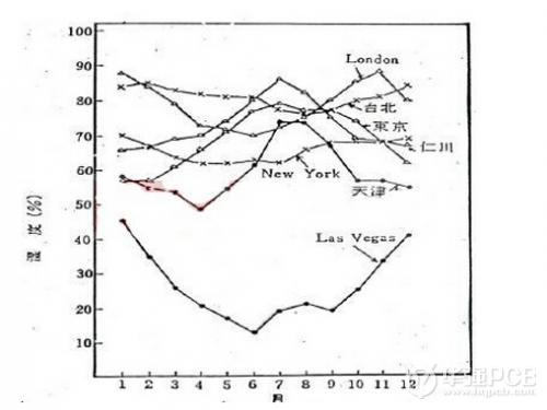 以上兩種情況是針對人體在接觸到電子產品時,因人體帶電或其他原因引起電子產品不能工作而進行的基本測試。下圖是一些地區在一年中不同月份的空氣濕度統計。從圖中可以看出Lasvegas全年的濕度最少,該地區的電子產品要特別注意ESD的保護。
