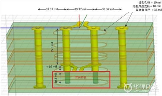 過孔是鍍在電路板頂層與底層之間的通孔外的金屬圓柱體。信號過孔連接不同層上的傳輸線。過孔殘樁是過孔上未使用的部分。過孔焊盤是圓環狀墊片,它們將過孔連接至頂部或內部傳輸線。隔離盤是每個電源或接地層內的環形空隙,以防止到電源和接地層的短路。