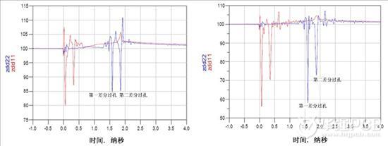 圖3:TDR阻抗波特圖(左:使用背面鉆孔,ZDIFF大約為85Ω;右:無背面鉆孔,ZDIFF大約為58Ω)