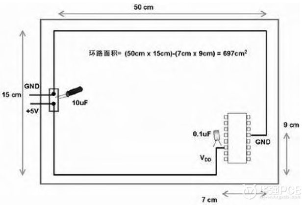 上圖通過(guò)改進(jìn)——電源與地線靠近走線,減小了回路面積,降低了電磁干擾(679/12.8,約54倍)。因此,電源與地盡量應(yīng)該靠近走線!而信號(hào)線之間則應(yīng)該盡量避免并行走線,降低信號(hào)之間的互感效應(yīng)。