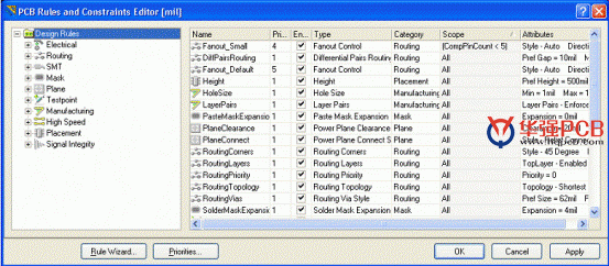 例如,一塊板可以先設置一個寬度約束規則,然后地線設定第二個寬度約束規則,某些連接地的線設定第三寬度約束規則(獨立于前兩個規則)。規則按照優先順序顯示。