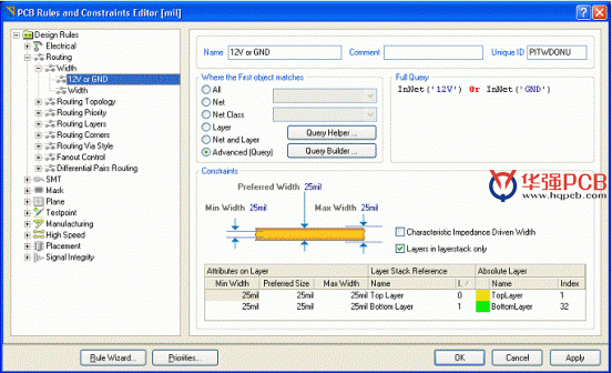 9 、在PCB Rules的底部和Constraints Editor對話框中,點擊約束值(10mil)并鍵入新的值,將Min Width, Preferred Width和Max Width改變為25mil。新規則現在已經被設置,可以選擇設置其它規則或者保存并關閉對話框。