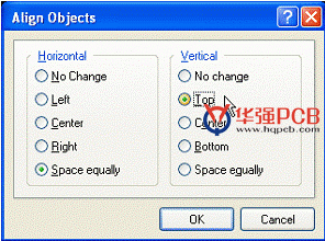 點擊右鍵并選擇Align>>Align(捷徑:A,A) 。在Align Objects對話框中,點擊Space Equally在Horizontal選項并按一下Top在Vertical選項中。四個電阻現在對齊并有同樣間隔。