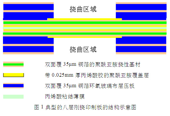 剛撓印制板是在撓性印制板上再粘結兩個(或兩個以上)剛性外層,剛性層上的電路與撓性層上的電路通過金屬化孔相互連通。每塊剛撓性印制板有一個或多個剛性區和一個或多個撓性區。圖1爲一塊典型的八層剛撓印制板的結構示意圖。