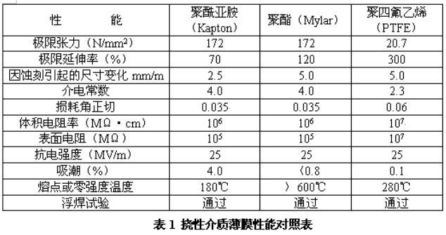 1.撓性材料:常用的撓性介質薄膜有聚酯類、聚酰亞胺類和聚氟類,選擇撓性介質薄膜應從材料的耐熱性能、覆形性能及厚度等進行綜合考察;常用的粘結薄膜主要有丙烯酸類,環氧類和聚酯類,選擇粘結薄膜則主要考察材料的流動性及其熱膨脹系數(表1、表2爲撓性薄膜性能對照表)