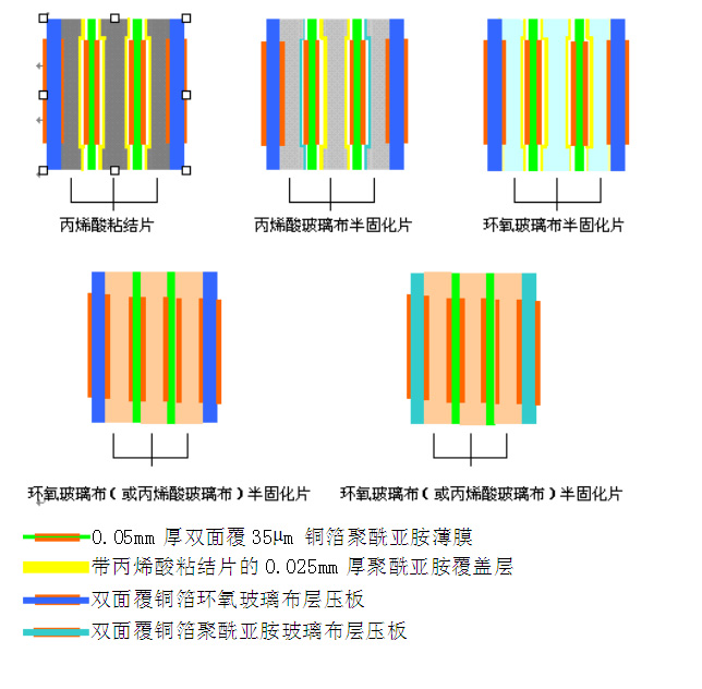 選用不同類型的粘結片對剛撓印制板的結構有著直接的影響。圖3a-b是采用不同類型粘結片粘結內層的剛撓八層印制板結構示意圖。其中a類是全部采用丙烯酸粘結薄膜做爲內層的粘結片,在這種結構中,丙烯酸厚度的百分比相當大,因而整個剛撓印制板的熱膨脹系數也很大,這種結構的金屬化孔在熱應力試驗中容易失敗。在這種結構中靠降低丙烯酸粘結片的厚度達到減少Z軸膨脹的方法是不實際的,一方面這不利于無氣泡層壓,另一方面靠增加壓力彌補其厚度的不足往往還會造成撓性內層圖形的偏移超差。結構b是采用了用玻璃布做增強材料的丙烯酸代替無增強材料的丙烯酸粘結片。這種有增強材料的丙烯酸不但能滿足無氣泡層壓的要求而且增加了結構的硬度。它的缺點是在孔化之前要處理凸出的玻璃纖維頭。結構c中采用環氧玻璃布半固化片粘結壓了覆蓋層的撓性內層。
