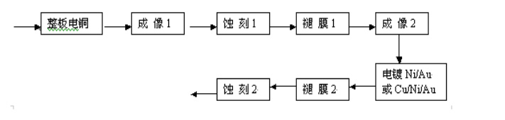 其中成像1是爲了蝕掉撓曲區域的銅,此流程的兩次成像在撓曲區域都設計爲非曝光區。這種方法工藝比較復雜,且經過多次褪膜,覆蓋層受褪膜堿液(NaOH)較長時間的浸泡,其覆蓋膜的顔色及撓曲性能都會受到一定的影響,同時,由于增加了蝕刻底銅的厚度(銅箔銅厚+電鍍銅厚),也就增加了蝕刻的制作難度,特別是含精密線路(線寬/線距:2~3mil)的蝕刻尤爲困難,建議含有精密線路時,電銅分兩次完成,即在圖形電鍍時電鍍Cu/Ni/Au,在整板電銅時電鍍大約5μm銅厚(孔內最小銅厚)即可以減小蝕刻的制作難度。