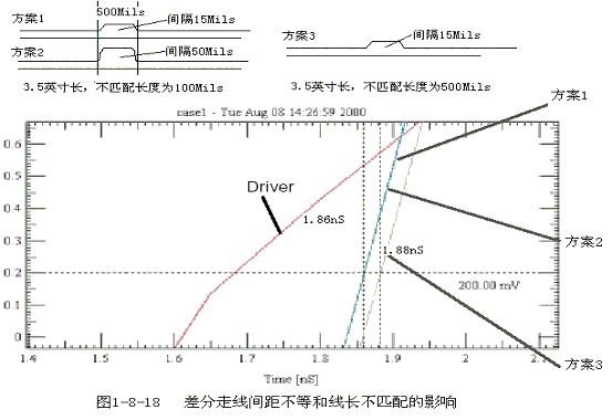 從 上面的仿真結(jié)果看來(lái),方案1和方案2波形幾乎是重合的,也就是說(shuō),間距不等造成的影響是微乎其微的,相比較而言,線長(zhǎng)不匹配對(duì)時(shí)序的影響要大得多(方案 3)。再?gòu)睦碚摲治鰜?lái)看,間距不一致雖然會(huì)導(dǎo)致差分阻抗發(fā)生變化,但因?yàn)椴罘謱?duì)之間的耦合本身就不顯著,所以阻抗變化范圍也是很小的,通常在10%以內(nèi), 只相當(dāng)于一個(gè)過(guò)孔造成的反射,這對(duì)信號(hào)傳輸不會(huì)造成明顯的影響。而線長(zhǎng)一旦不匹配,除了時(shí)序上會(huì)發(fā)生偏移,還給差分信號(hào)中引入了共模的成分,降低信號(hào)的質(zhì) 量,增加了EMI。