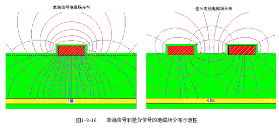 誤區(qū)一:認(rèn)為差分信號(hào)不需要地平面作為回流路徑,或者認(rèn)為差分走線彼此為對(duì)方提供回流途徑。造成這種誤區(qū)的原因是被表面現(xiàn)象迷惑,或者對(duì)高速信號(hào)傳 輸?shù)臋C(jī)理認(rèn)識(shí)還不夠深入。從圖1-8-15的接收端的結(jié)構(gòu)可以看到,晶體管Q3,Q4的發(fā)射極電流是等值,反向的,他們?cè)诮拥靥幍碾娏髡孟嗷サ窒? (I1=0),因而差分電路對(duì)于類似地彈以及其它可能存在于電源和地平面上的噪音信號(hào)是不敏感的。地平面的部分回流抵消并不代表差分電路就不以參考平面作 為信號(hào)返回路徑,其實(shí)在信號(hào)回流分析上,差分走線和普通的單端走線的機(jī)理是一致的,即高頻信號(hào)總是沿著電感最小的回路進(jìn)行回流,最大的區(qū)別在于差分線除了 有對(duì)地的耦合之外,還存在相互之間的耦合,哪一種耦合強(qiáng),那一種就成為主要的回流通路,圖1-8-16是單端信號(hào)和差分信號(hào)的地磁場(chǎng)分布示意圖。