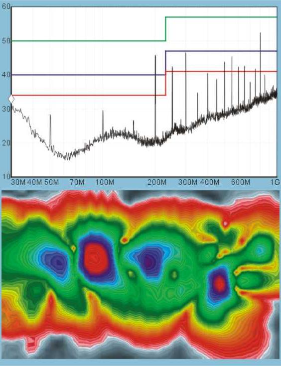 EMC 設計至今主要還是靠EMC工程師/硬件工程師的經驗來開展設計。作為工程設計,我們無需作過多的理論分析,但我們必須具備一些常規的工程設計經驗。同時借 助一些近場探頭等輔助手段來解決EMC問題。上圖為借助近場探頭測出的RE指標以及特定頻率的EMI物理空間分部圖。