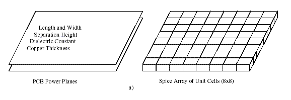 這個PI仿真工具的理論基礎是傳輸線,采用有限元的方式對電源平面進行劃分,把電源和相應的地平面匹配成一對平板電容,并劃分成幾個區域,如圖所示: