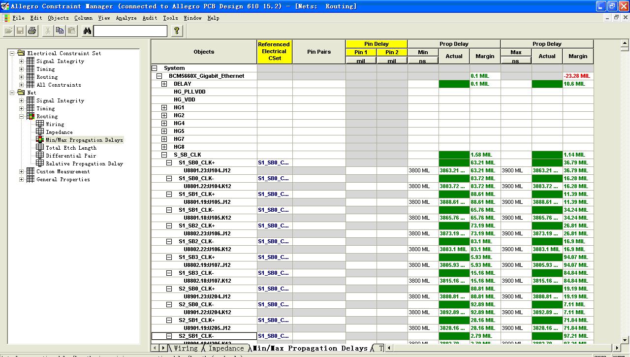 仿真提取的布線約束可以直接導入到Allegro的電氣規則管理器中,這個管理器可以方便地對時序要求的等長規則進行約束,在布線時,當長度不符合所規定的規則時,Allegro可以實時進行告警。