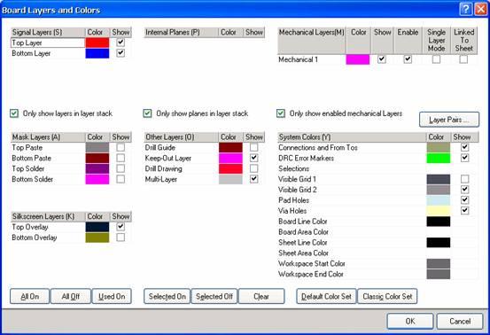 在 PCB 圖紙上右擊鼠標,在彈出的右鍵菜單中執(zhí)行命令 Options/Board Layers&Colors ,系統(tǒng)將彈出 Board Layers and Colors (板層和顏色管理)對話框,如圖31 所示。
