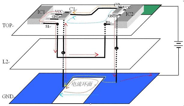 在低頻時,如果S1端輸出高電平,整個電流回路是電源經(jīng)導線接到VCC電源平面,然后經(jīng)橙色路徑進入IC1,然后從S1端出來,沿第二層的導線經(jīng)R1端進入IC2,然后進入GND層,經(jīng)紅色路徑回到電源負極。