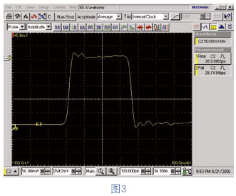 從另外一個角度來考慮,TDR設(shè)備的系統(tǒng)帶寬限制了TDR測試的分辨率。在IPC-TM-650測試手冊中對TDR設(shè)備的上升時間是按照系統(tǒng)上升時間(tsys)來定義的。當(dāng)我們要測量一臺TDR設(shè)備的系統(tǒng)上升時間時,我們可以短路一臺TDR設(shè)備的輸出,此時可以測出該TDR設(shè)備的(tsys)(上升時間以及下降時間)。例如圖3的TDR設(shè)備的系統(tǒng)上升時間就高達28ps左右。