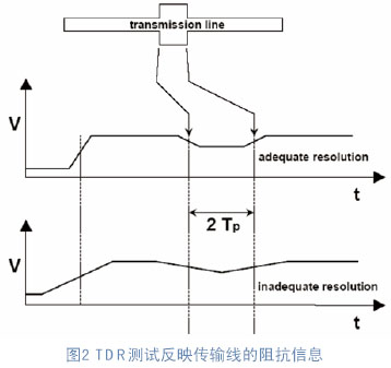 當(dāng)傳輸線上出現(xiàn)阻抗不連續(xù)的現(xiàn)象時,在阻抗變化的地方階躍信號就會產(chǎn)生反射的現(xiàn)象,如果將反射信號進行取樣并顯示在示波器的屏幕上,就會得出如圖2所示的波形,從波形中我們可以看出一條被測試的傳輸線在不同位置上的阻抗變化。同時我們可以比較圖2中的兩個波形。這是使用兩臺分辨率不同的TDR設(shè)備在測試同一條傳輸線時獲得的測試結(jié)果。對于傳輸線阻抗變化的反映一個明顯而另一個不明顯。TDR設(shè)備感知傳輸線阻抗不連續(xù)的分辨率取決于TDR設(shè)備所發(fā)出的階躍信號上升時間的快慢,上升時間快所獲得的分辨率就高。而TDR設(shè)備的上升時間往往和測試系統(tǒng)的帶寬緊密相關(guān),帶寬高的測試系統(tǒng)有更快的上升時間。