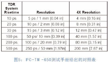 為了方便測試者了解TDR測試的分辨率以及PCB板走線的最小測試長度,在IPC-TM-650測試手冊的表4-1(圖5)中給出了速查數(shù)據(jù)。