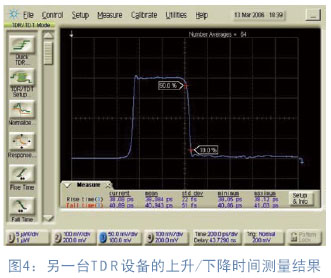 圖4是另一臺TDR設(shè)備的系統(tǒng)上升/下降時間的測試結(jié)果,系統(tǒng)的上升/下降時間在38ps~40ps之間。可見不同的TDR設(shè)備在系統(tǒng)上升/下降時間上是有很大的區(qū)別的,由此帶來的就是傳輸線阻抗測試分辨率的很大不同。