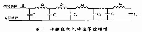 對于均勻導線,在不考慮外部環境變化的情況下,電阻R、傳輸線寄生電感L和寄生電容C平均分布(即L1=L2=…=Ln;C1=C2=…=Cn+1)。假設傳輸線為無損傳輸線,即R=0時,若取線參數:單位長度電容C1、單位長度電感量L1和傳輸線的總長度為Len,則有: