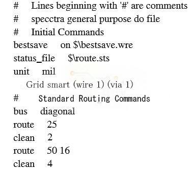 項目開始時的全自動布線的思路是“通過一個DO 文件控制(如下圖1)自動布線軟件SPECCTRA,最終完成PCB布線的全面自動化”。后來經過實踐發現這想法太理想了。最終演變成:研究好格點,FANOUT及把PCB的設計精力放在規則的制定,拓撲,T點的擺放及仿真及各種信號接口的認識上,終于把業務與技能推到更前端并引出規則驅動設計的概念。