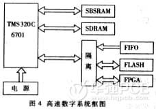 在正交頻分復用OFDM調制解調系統(tǒng)中,時鐘率高達167MHz,時鐘沿時間為0.6ns,系統(tǒng)構成中有TMS320C6701 DSP以及SBSRAM、SDRAM、FIFO、FLASH和FPGA(如圖4所示)。其中FIFO采用異步FIFO,主要用作與前端接口的數(shù)據(jù)緩存;DSP的DMA高速地將數(shù)據(jù)搬移到SBSRAM或者SDRAM中;DSP處理完數(shù)據(jù)由多通道緩沖串口(MCBSP)將BIT流輸出到FPGA中進行解碼處理。由于系統(tǒng)工作在很高的時鐘頻率上,所以系統(tǒng)的信號完整性問題就顯得十分重要。