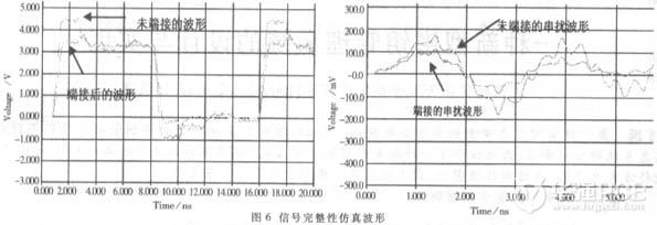 第三點是解決信號的反射、串擾噪聲問題。這一點在一個高速系統(tǒng)中顯得尤其重要,解決的辦法是通過采用先進的EDA工具,選擇正確的布線策略和端接方式,從而得到理想的信號波形。在設計本系統(tǒng)時,基于IBIS模型,使用Hyperlynx進行設計前仿真,根據(jù)仿真結果,選擇出最優(yōu)的布線策略。圖6為端接和未加端接的信號波形及串擾波形圖,從圖中可以看到端接對消除反射、振蕩和串擾起到了明顯的作用。