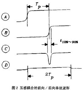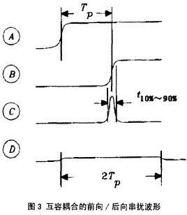 如圖2所示,往C方向的前向干擾能量,是和入射電壓及每個(gè)互感分量Lm成正比,因?yàn)樗星跋蚋蓴_能量幾乎同時(shí)抵達(dá)C點(diǎn),所以前向干擾能量與兩傳輸線的互感總量成正比,傳輸線平行的長(zhǎng)度越長(zhǎng),所產(chǎn)生的互感總量就越大,前向干擾能量也隨即增加;然而往D點(diǎn)的后向干擾能量與往C點(diǎn)的前向干擾能量不同的是,雖然兩者耦合的總區(qū)域是一樣的,但每個(gè)互感變壓器所感應(yīng)的干擾分量是依序到達(dá)D,后向干擾能量的有效時(shí)間長(zhǎng)達(dá)2Tp(Tp為傳播延時(shí)),隨著線路平行長(zhǎng)度的延長(zhǎng) (即互感增加),后向串?dāng)_的幅度大小是不會(huì)變化的,而持續(xù)時(shí)間會(huì)增加。