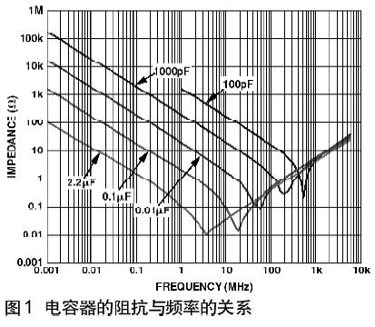 并聯不同的電容值的電容器有助于確保電源引腳在很寬的頻帶上只能看到很低的交流(AC)阻抗。這對于在運算放大器電源抑制比(PSR)衰減頻率處尤其重要。該電容器有助于補償放大器降低的PSR。在許多十倍頻程范圍內保持低阻抗的接地通路將有助于確保有害的噪聲不能進入運算放大器。圖1示出了采用多個并聯電容器的優點。在低頻段,大的電容器提供低阻抗的接地通路。但是一旦頻率達到了它們自身的諧振頻率,電容器的容性就會減弱,并且逐漸呈現出感性。這就是為什么采用多個電容器是很重要的原因:當一個電容器的頻率響應開始下降時,另一個電容器的頻率響應開始起作用,所以能在許多十倍頻程范圍內保持很低的AC阻抗。
