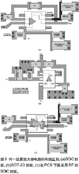 圖9示出了采用SOIC封裝(a)和SOT-23封裝(b)的運算放大器之間的布線區別。每種封裝都有它自身的一些問題。重點看(a),仔細觀察反饋路徑就發現有多種方法連接反饋。最重要的是保證印制線長度最短。反饋路徑中的寄生電感會引起振鈴和過沖。在圖9(a)和9(b)中,環繞放大器連接反饋路徑。圖9(c)示出了另外一種方法——在SOIC封裝下面連接反饋路徑——這樣就減小了反饋路徑的長度。每種方法都有細微的差別。第一種方法會導致印制線過長,會增大串聯電感。第二種方法采用了通孔,會引起寄生電容和寄生電感。在給PCB布線時必須要考慮這些寄生效應的影響及其隱含的問題。SOT-23布線差幾乎是最理想的:反饋印制線長度最短,而且很少利用通孔;負載和旁路電容從很短的路徑返回到相同的地線連接;正電源端的電容(圖9(b)中未示出)直接放在PCB背面的負電源電容的下面。