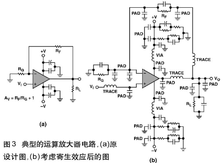 所謂寄生效應就是那些溜進你的PCB并在電路中大施破壞、令人頭痛、原因不明的小故障。它們就是滲入高速電路中隱藏的寄生電容和寄生電感。其中包括由封裝引腳和印制線過長形成的寄生電感;焊盤到地、焊盤到電源平面和焊盤到印制線之間形成的寄生電容;通孔之間的相互影響,以及許多其它可能的寄生效應。圖3(a)示出了一個典型的同相運算放大器原理圖。但是,如果考慮寄生效應的話,同樣的電路可能會變成圖3(b)那樣。