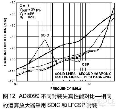 這種引腳排列還有一個好處就是降低了二次諧波失真。傳統運算放大器的引腳配置中引起二次諧波失真的一個原因是同相輸入和負電源引腳之間的耦合作用。LFCSP封裝的低失真引腳排列消除了這種耦合所以極大地降低了二次諧波失真;在有些情況下最多可降低14 dB。圖12示出了AD80992 采用SOIC封裝和LFCSP封裝失真性能的差別。