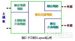 圖2是典型的印刷電路基板Layout范例,如圖所示該電路基板是復數個電路基板之中的一片,此時只要透過主機板就能夠進行信號交易。主機板執行基板之間的數據交易時通常會有Bus通行,雖然圖2的基板主體是數字電路,不過卻混載小規模的模擬電路。